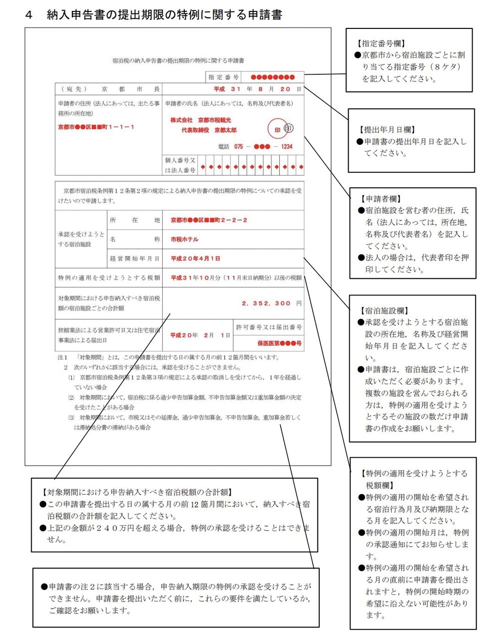 特例の適用を受ける場合は、宿泊施設ごとに「納入申告書の提出期限の特例に関する申請書」を提出。